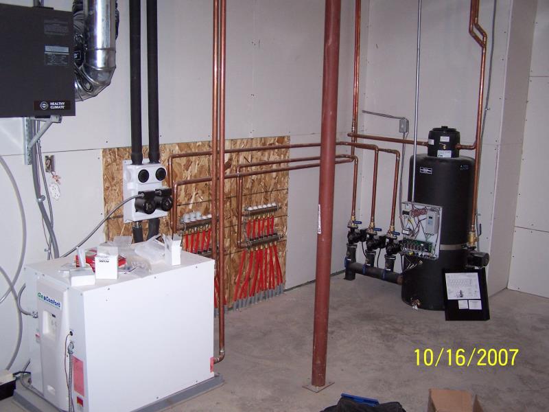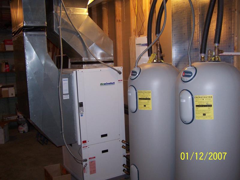 GeoComfort equipment was utilized here, a 5-ton Serenity water to air unit to provide heating for the main and second floors and cooling for the entire home, this unit is installed with zoning and 3 thermostats to provide control on each level of the home, this machine has a desuper heater to provide a percentage of the hot water for the home, it supplements twin 80 gallon Marathon electric water heaters.